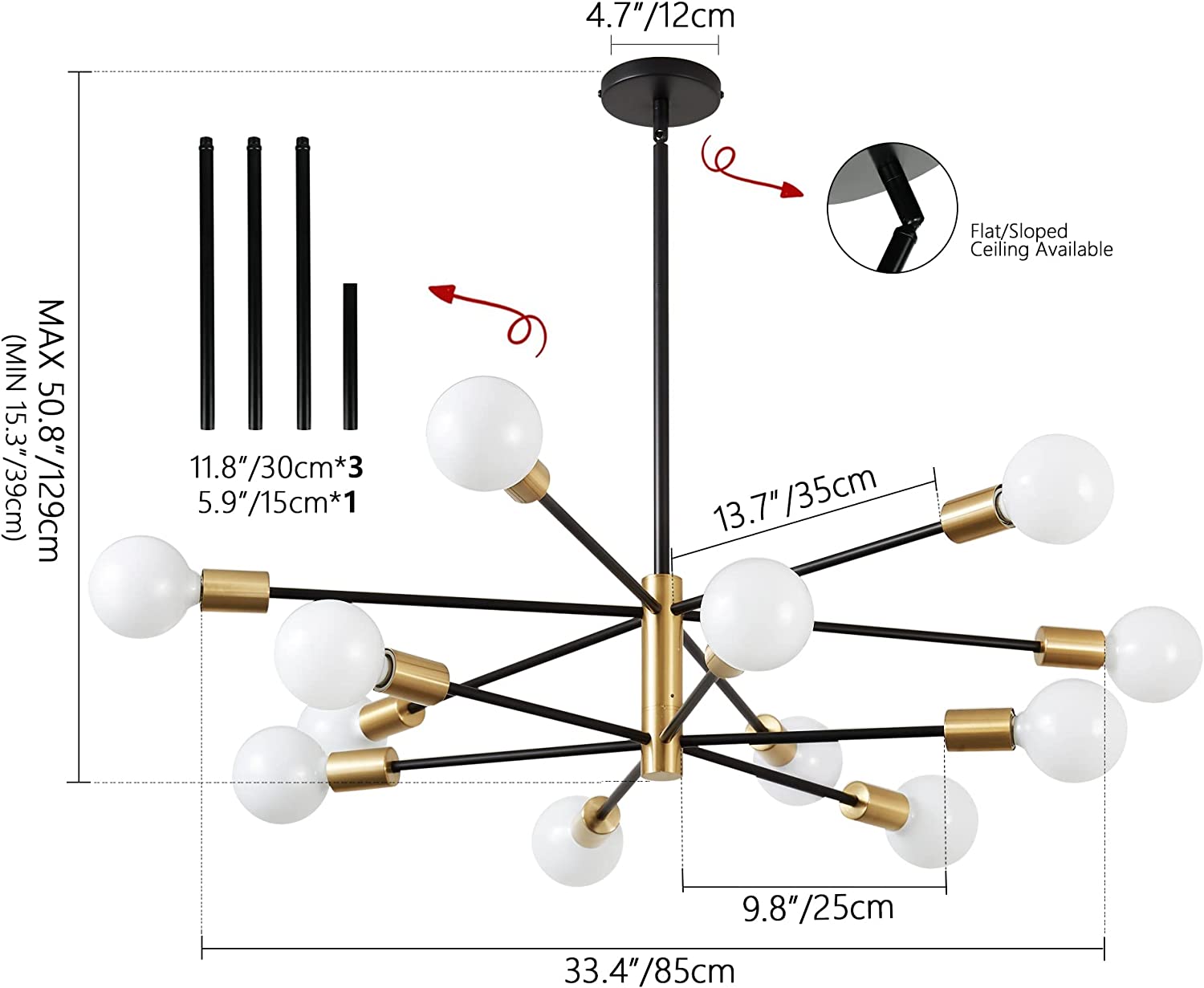 • Bulb Requirements - Uses 12 medium-base (E26) light bulbs, max 40W LED recommended (bulbs NOT included). The black and gold chandelier supports to use dimmable bulbs and compatible dimmer switch to create the perfect atmosphere (dimmer switch not included).